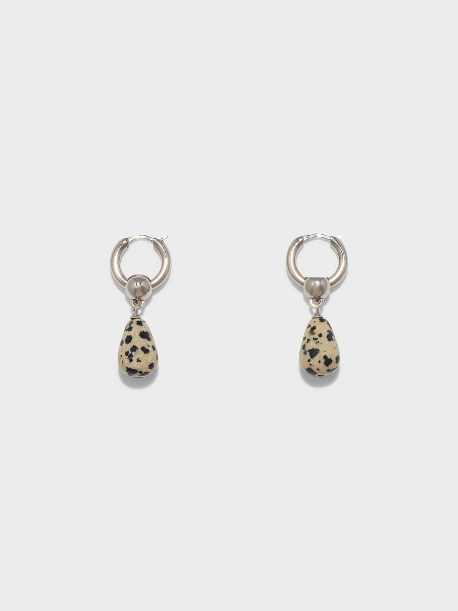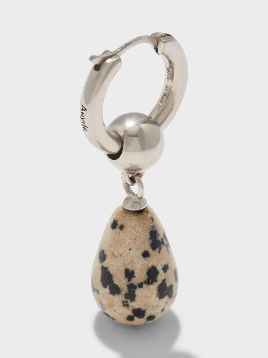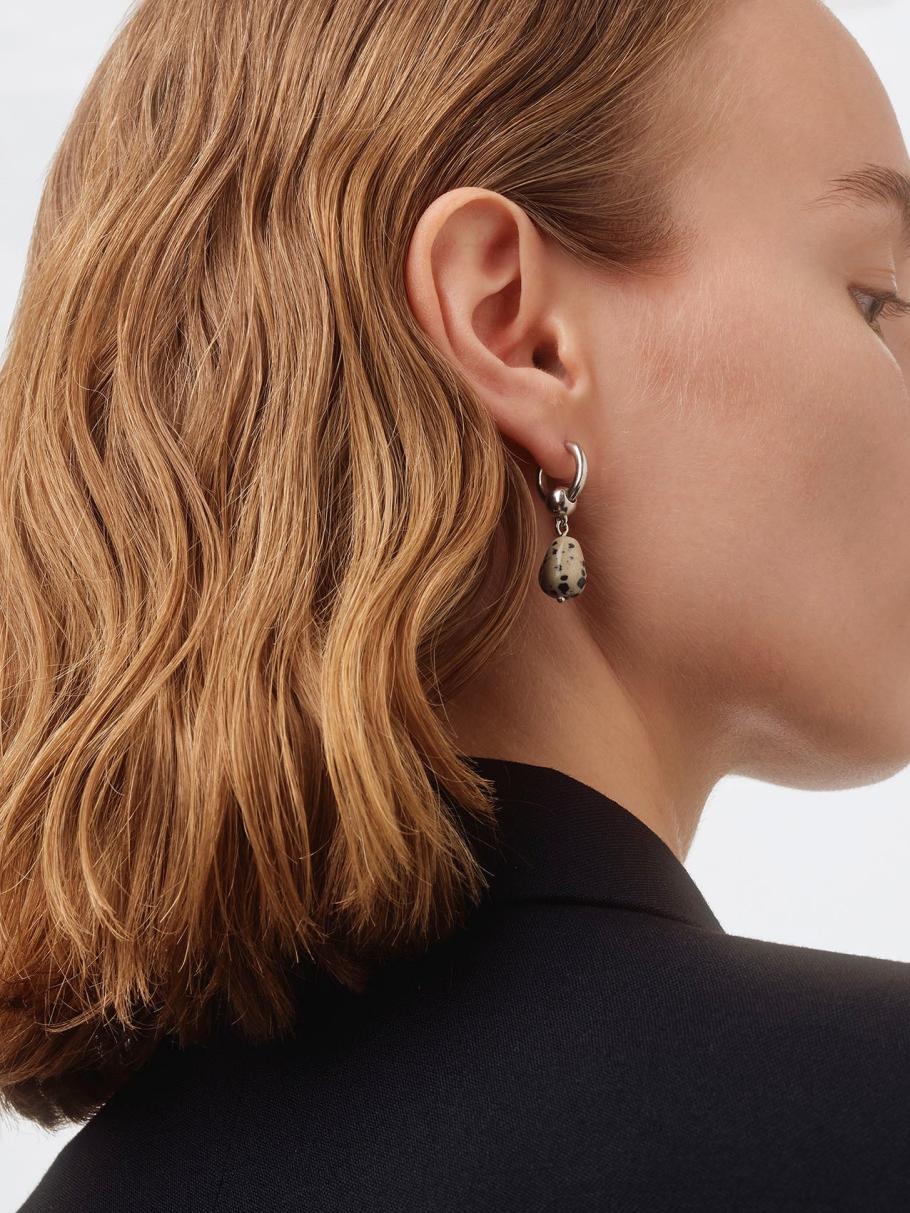 Elvin are Aeyde’s diaspro dalmata stone pendant earrings with palladium-plated fixtures.